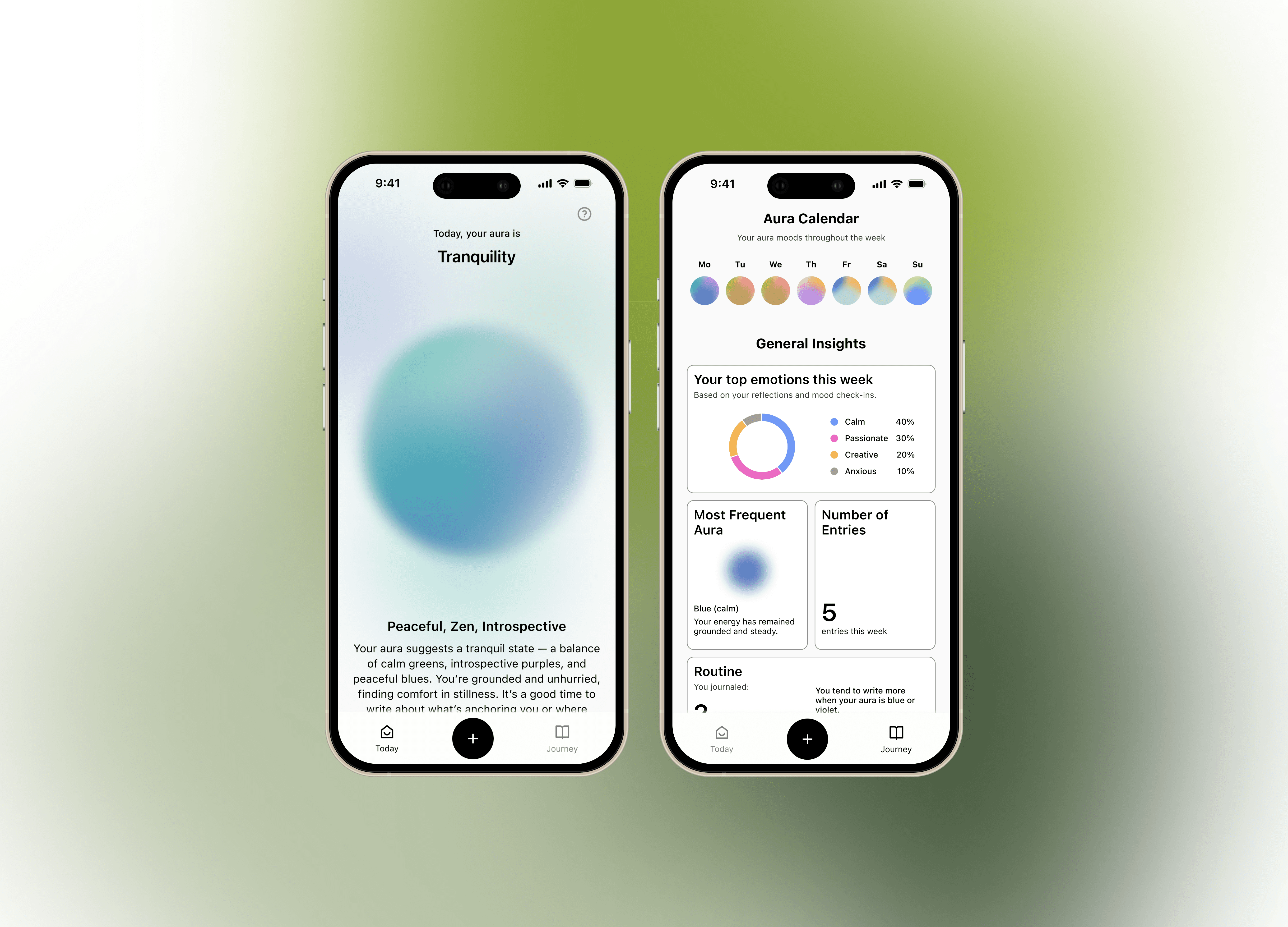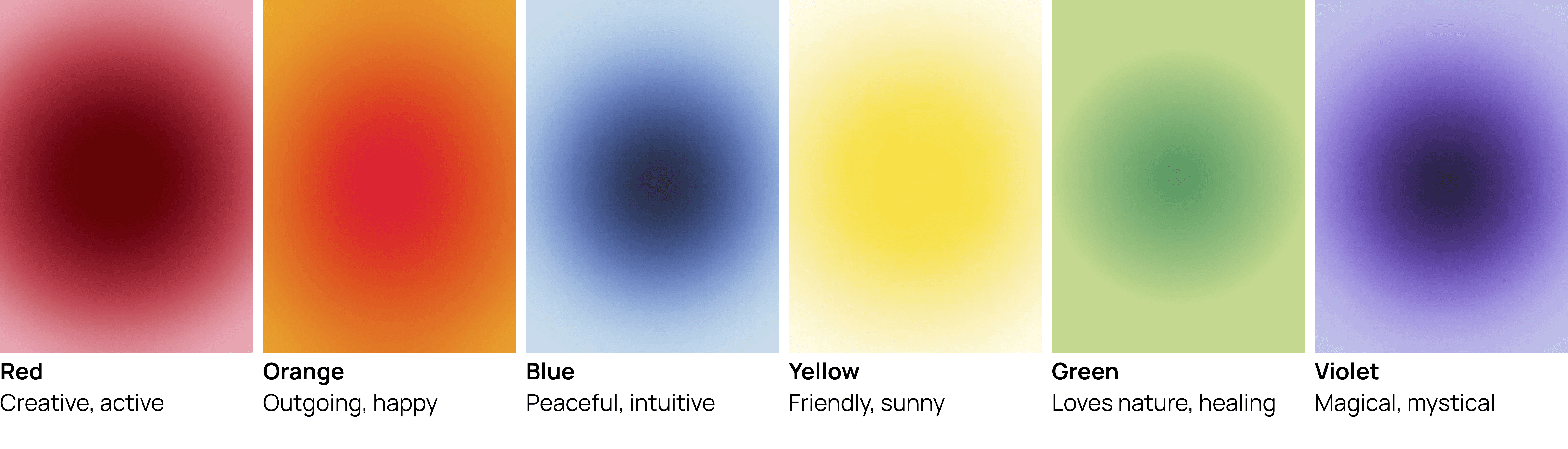 Haven’s emotional language is inspired by aura rings and aura photography, using colour as an intuitive way to express internal states. This approach is supported by colour psychology research, which suggests emotional responses to colour often occur before cognitive interpretation.