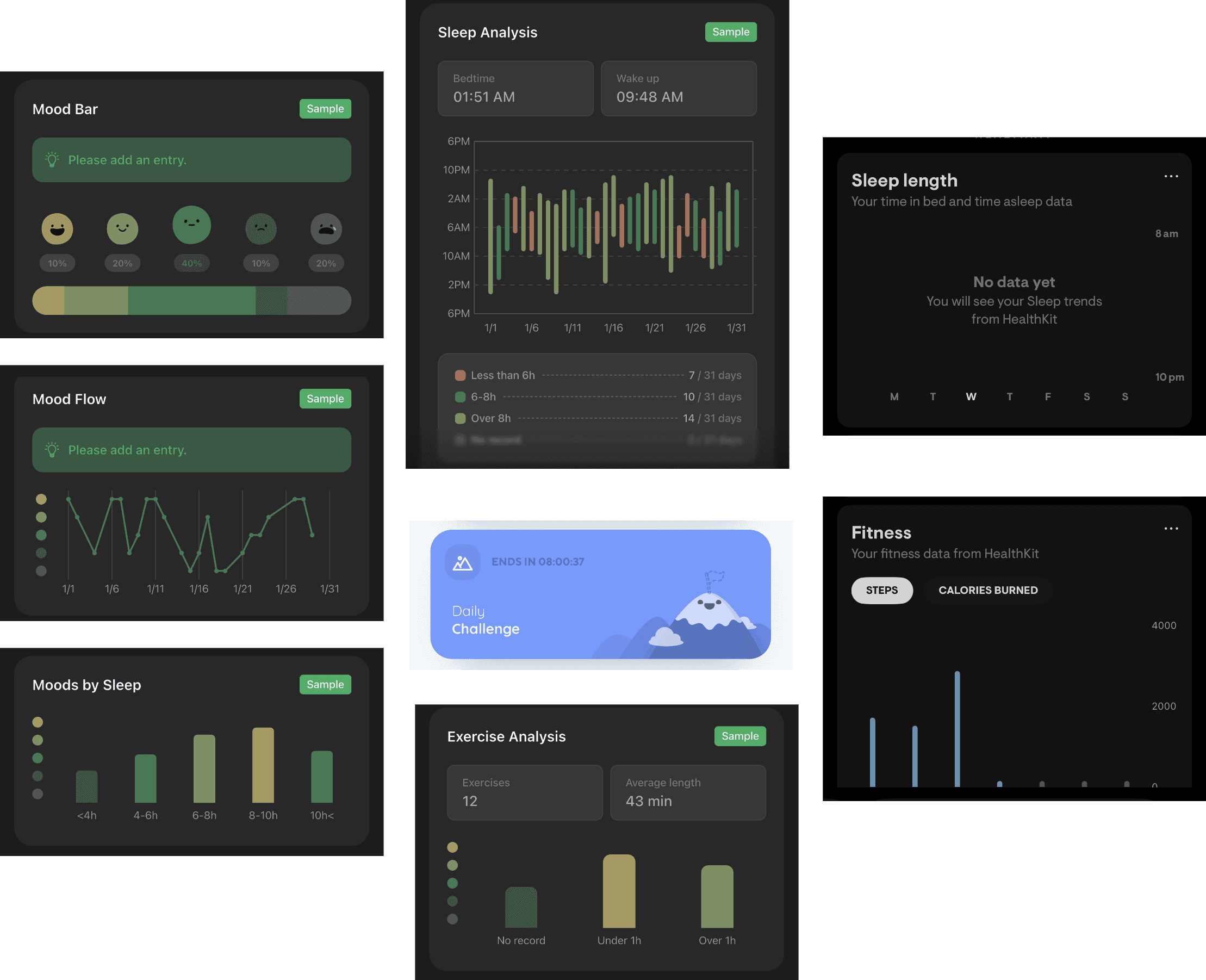 As users move through guided prompts, the interface subtly adapts to their emotional check-in. These changes are intentionally gentle, creating a sense of being acknowledged without judgement or evaluation.